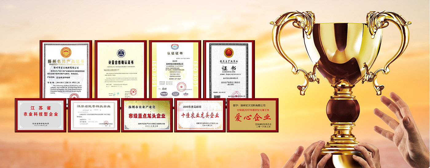 先后榮獲江蘇省飼料質(zhì)量合格產(chǎn)品、江蘇省名牌產(chǎn)品、揚(yáng)州市消費(fèi)者滿意商品、揚(yáng)州市質(zhì)量計量信得過產(chǎn)品等稱號。